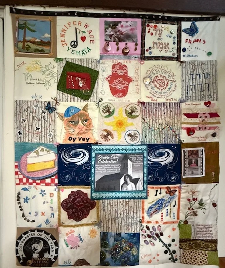 Margaret sends huge thanks to everyone who contributed artistry and love to her Double Chai quilt! And special thanks to Estreilla, who sewed it together and finished it in such a charming way. It’s hanging in Margaret’s house, where it radiates love and fun and friendship.