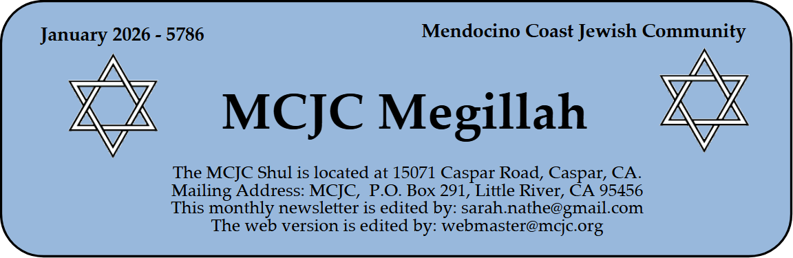 The Mendocino Megillah is published monthly as an emailed PDF and an online version. The online Megillah is posted on the newsletter page of the MCJC website: www.mcjc.org/newsletter. Any information on changes in email address or in email notifications should be sent to Sarah Nathe at sarah.nathe@gmail.com. If you choose not to be a contributing member of MCJC, we request a $54 annual fee for the Megillah.